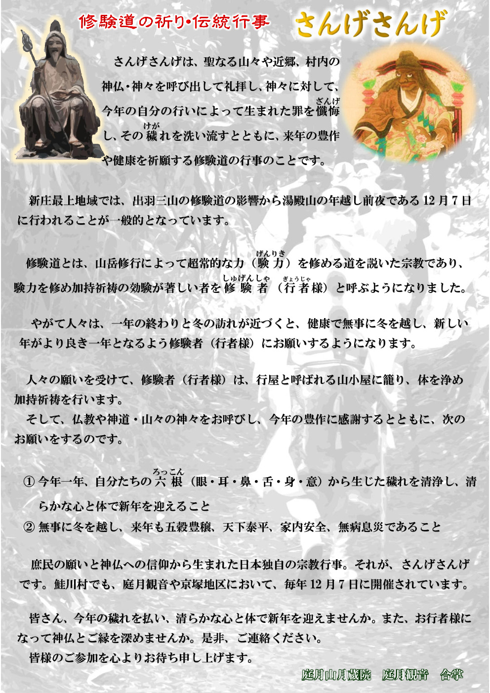 本寺院は、山形県最上郡鮭川村にある天台宗の寺院で、正式には庭月山月蔵院といいます。ご本尊は聖観世音菩薩さまで、庭月観音という名称で親しまれております。