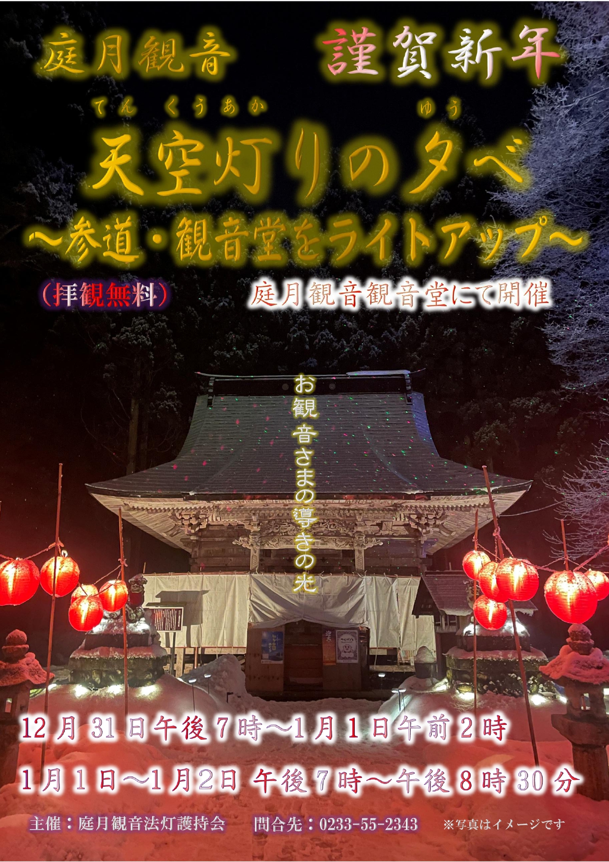令和7年度庭月観音灯ろう流し万灯供養会を開催します。また、庭月観音ライトアップ~天空灯りの夕べ~も、同時開催します。皆様の御参加・ご参拝を心よりお待ちしております。