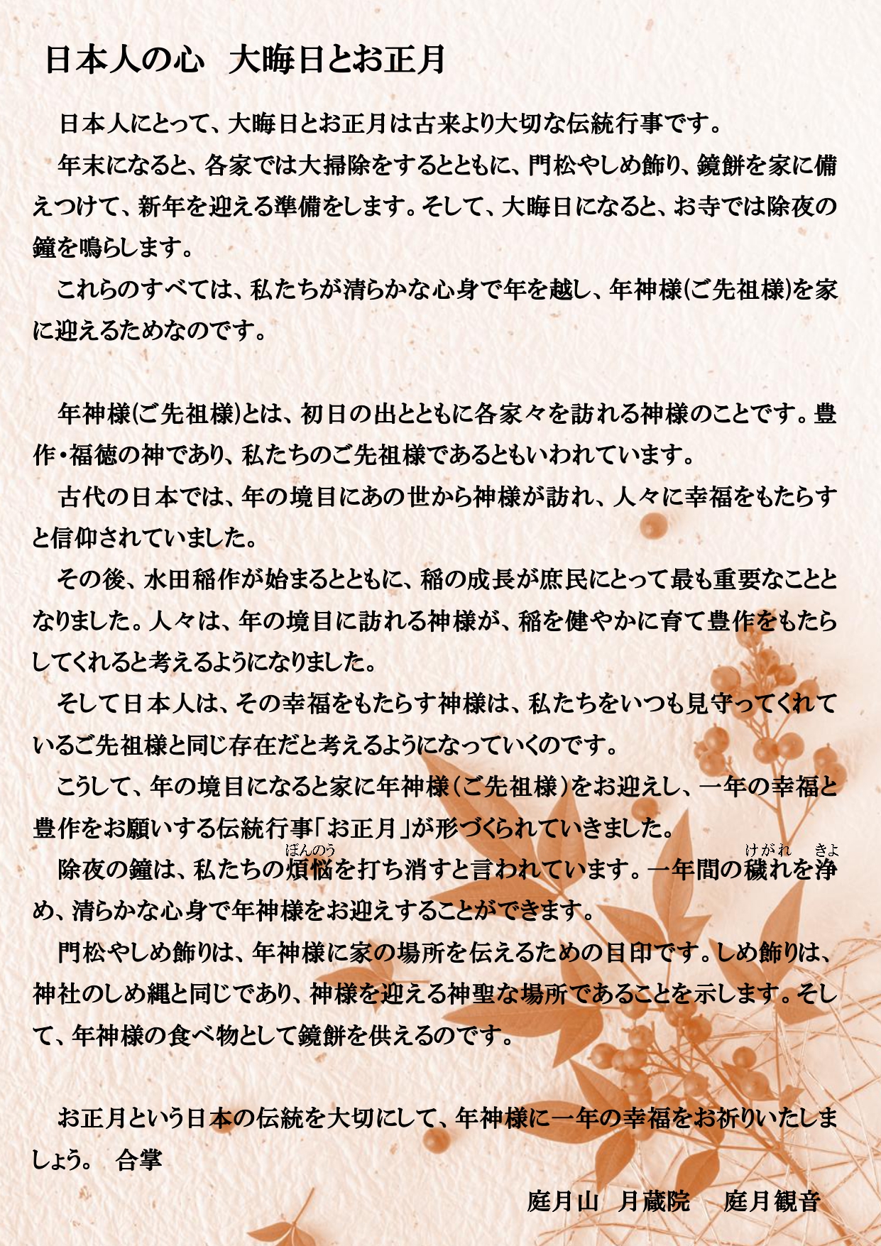 本寺院は、山形県最上郡鮭川村にある天台宗の寺院で、正式には庭月山月蔵院といいます。ご本尊は聖観世音菩薩さまで、庭月観音という名称で親しまれております。